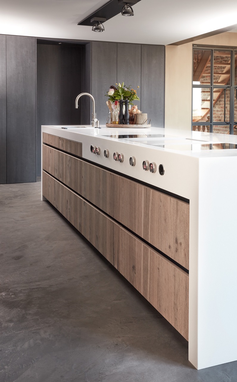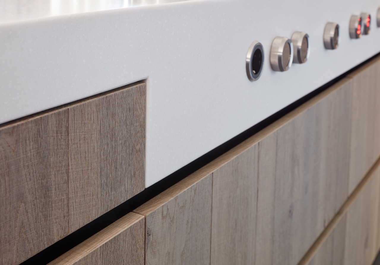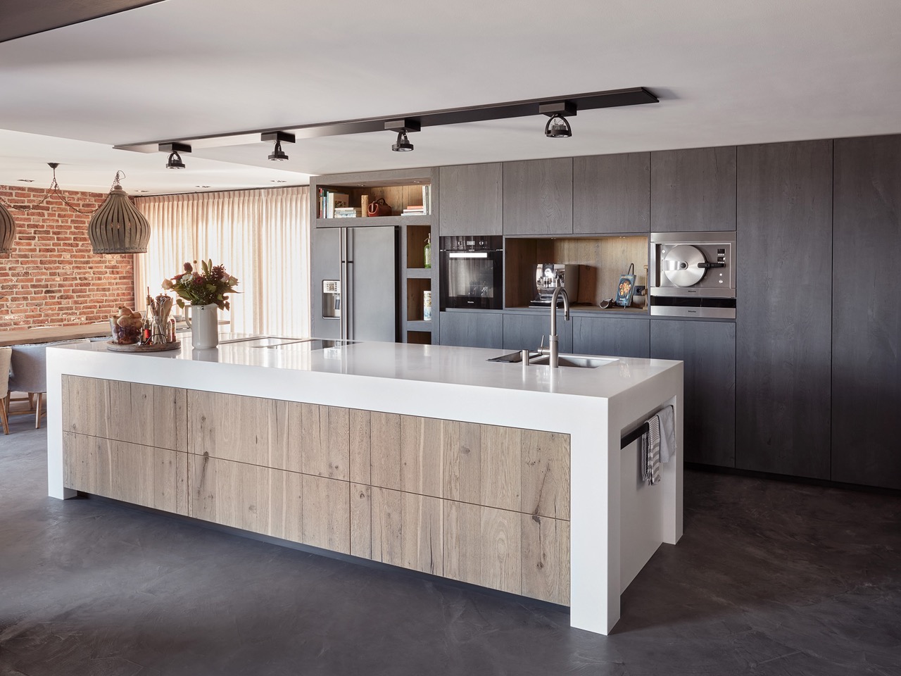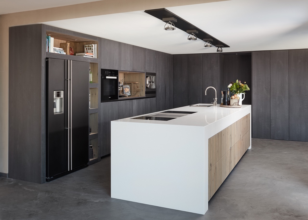 In deze woning hebben we de totaalinrichting gerealiseerd in eiken fineer zwart en grijs met werkbladen in Hi-macs Solid Surface.