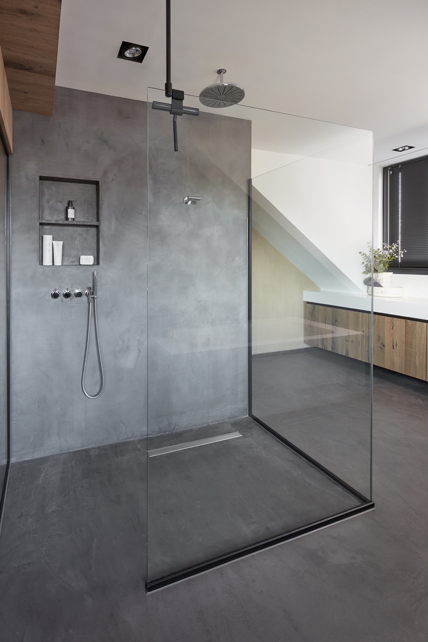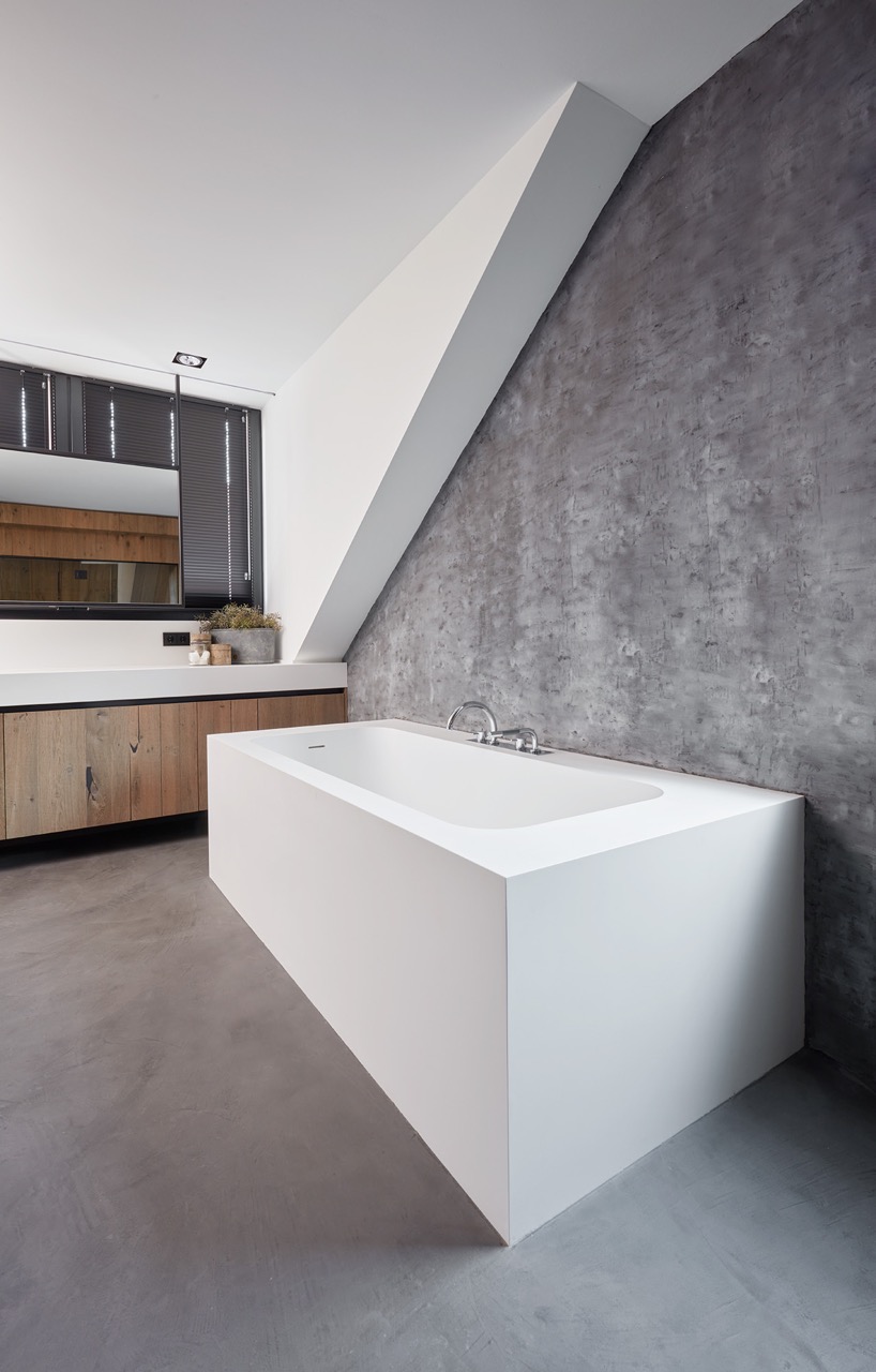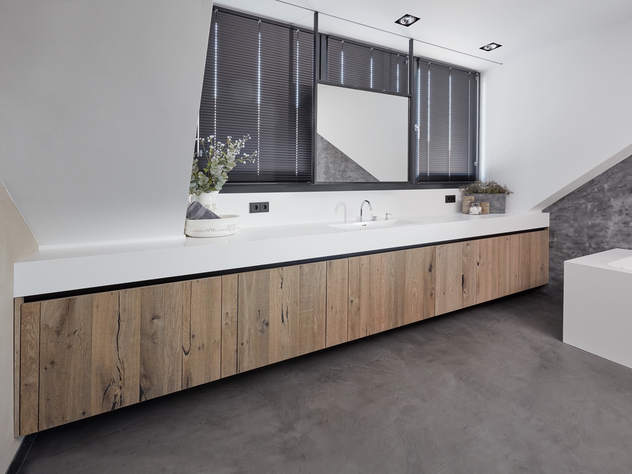 In de wellness-ruimte hebben wij het meubel gemaakt uit eiken grijs mat blank gelakt met een blad uit Hi-macs S28 Alpine White inclusief een geïntegreerde waskom uit hetzelfde materiaal. Wanden en vloer zijn bekleed met Beal Mortex betonciré.