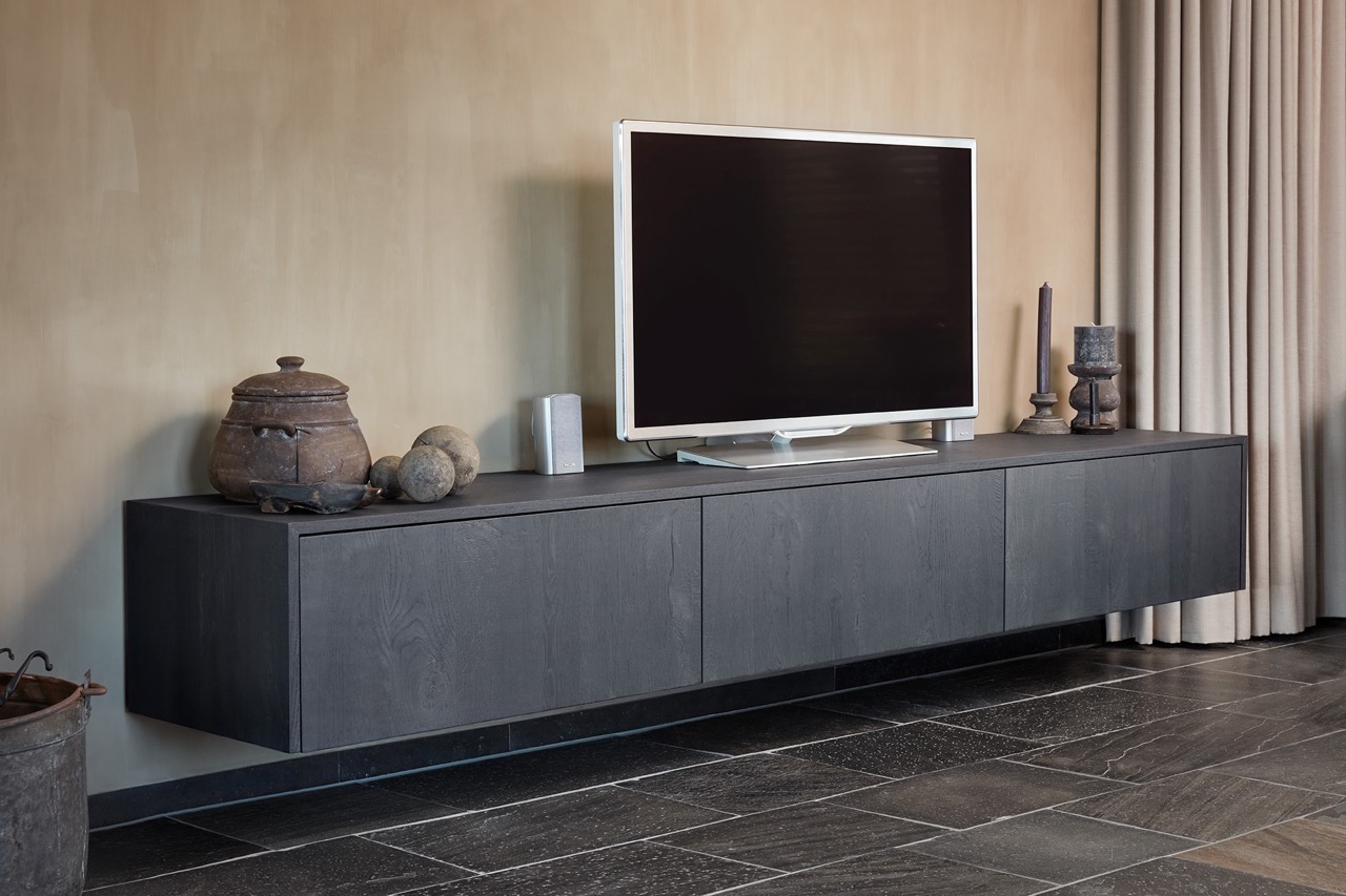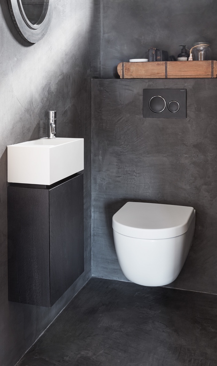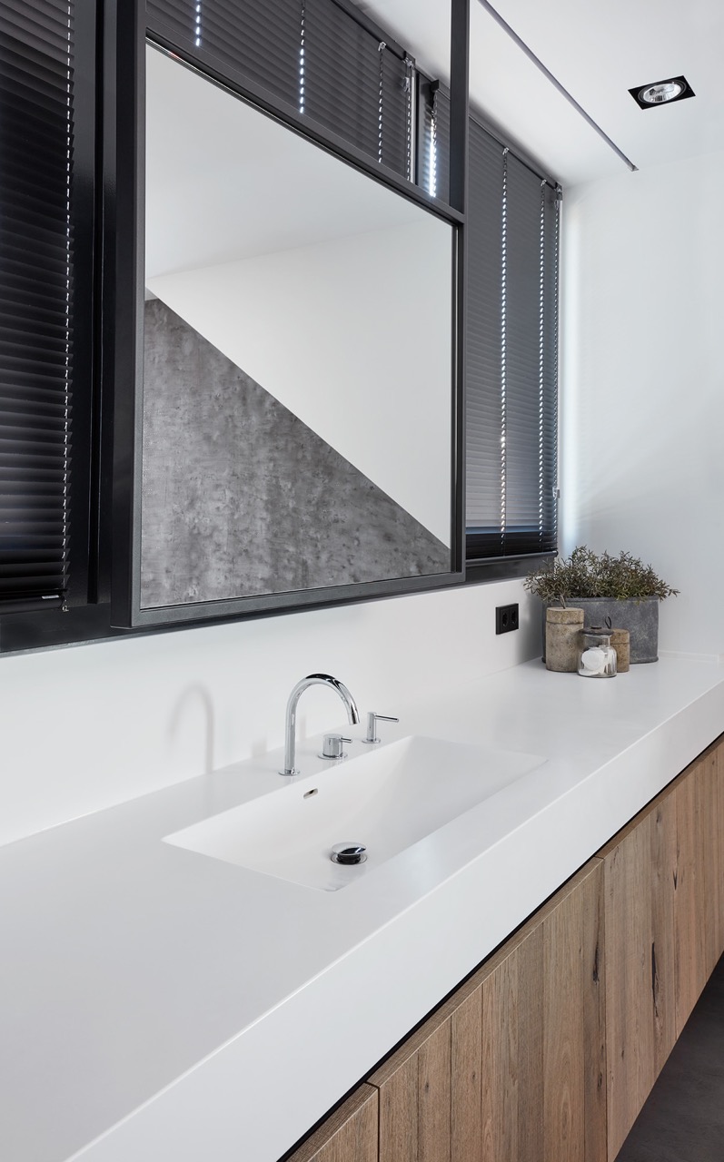 In de wellness-ruimte hebben wij het meubel gemaakt uit eiken grijs mat blank gelakt met een blad uit Hi-macs S28 Alpine White inclusief een geïntegreerde waskom uit hetzelfde materiaal. Wanden en vloer zijn bekleed met Beal Mortex betonciré.